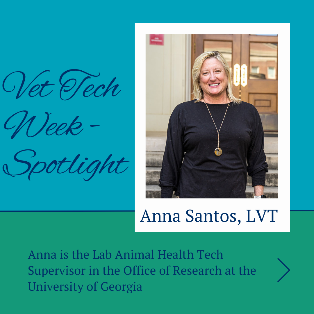 Today we're sharing an extra special spotlight. Anna Santos, LVT, is the lab animal health tech supervisor in the office of research at the University of Georgia. Anna is a long standing executive board member of GVTAA in various roles, is the Committee Vice-Chair for NAVTA's District Representative Committee, and is part of NAVTA's Membership Committee. Anna will be stepping away from GVTAA to focus on leading our industry in other ways, and we miss her already.